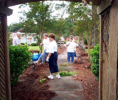 During the September 11 Day of Caring at the Coastal Center in Summerville, Charleston Southern University, a group of faculty, staff and students worked to beautify the garden. The area was given a fresh layer of pine straw and 27 bags of trash were collected.