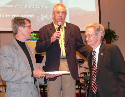 Jimmy Connelly, 86, was presented a certificate naming him deacon emeritus during the Oct. 26 homecoming service at Memorial Baptist Church, Saint George. Connelly is a veteran of World War II. He participated in nine amphibious landings in the Pacific in a Higgins boat. He and his wife Frances have been married 63 years. With Connelly is deacon chairman Bryan Jordan and pastor Clay Shook.