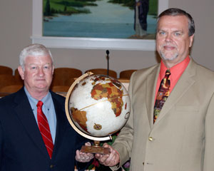 Union Baptist Church, Laurens, and Memorial Baptist Church, Aiken, were both recognized for surpassing $1 million in Cooperative Program giving. Above, Gary Anderson of the state convention presents a CP globe to Steve Gillette, pastor of Memorial. Below, Donnie Pitts, chairman of deacons at Union, and pastor Chris Garrison hold a CP globe.