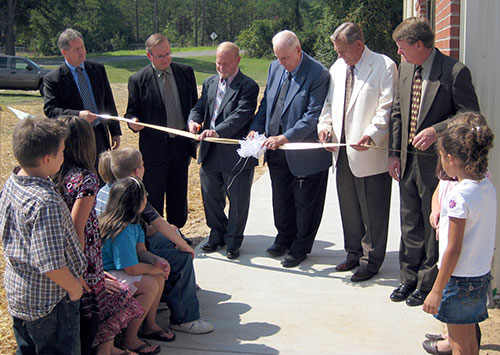 Union Baptist Church, Elgin, held the ribbon cutting for its 9,600-square-foot gym during its homecoming celebration. The gym includes a full-size basketball court, volleyball set-up and equipment/seating storage. From left: Pastor Jerry Lewis; Bill Dieckmann, director of missions for Columbia Metro Baptist Association; John “Buck” Martin, trustee and deacon chairman; G.P. Monroe Jr., trustee; Stanley Rabon, trustee; and Paul Behles, Built Wright Construction Co.