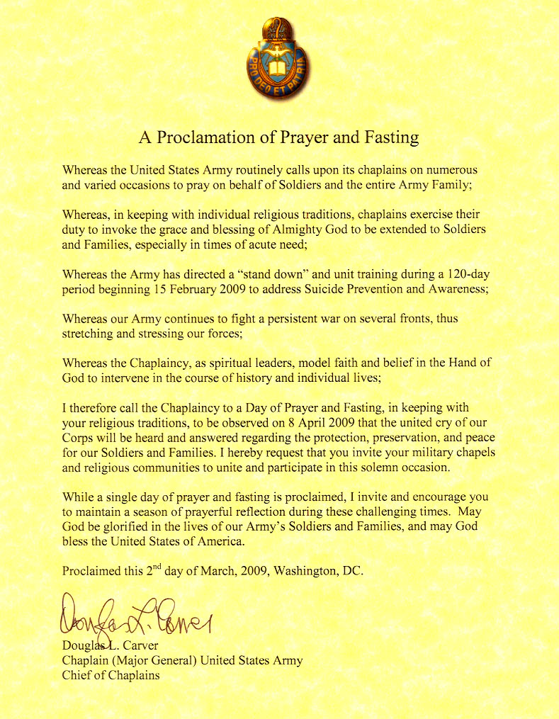 Chaplain Major General Douglas L. Carver has issued a “Proclamation of Prayer and Fasting,” to be observed by fellow chaplains on April 8.