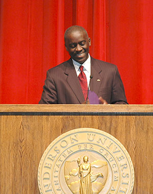 Anderson mayor Terrence Roberts spoke at Anderson University’s 98th Founders Day convocation Feb. 11. Roberts applauded the university for its commitment to service and urged students to make consistent service to their communities a lifetime pledge. Anderson University was founded as Anderson College in 1911. The school has been affiliated with the South Carolina Baptist Convention since its inception.