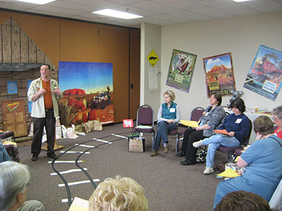 Tommy Comer, associate pastor at First Baptist Church, Gaffney, teaches a children’s leaders class for Vacation Bible School 2009, “Boomerang Express: It All Comes Back to Jesus.”This year’s LifeWay VBS is titled “Boomerang Express: It All Comes Back to Jesus.” The Australian theme was evident at the state clinic, as learning activities were held amidst backdrops of train depots, the Outback, boomerangs and kangaroos. Leaders were encouraged to use the theme as a way to attract attention and add to the fun of VBS, while keeping the focus on teaching the Bible.