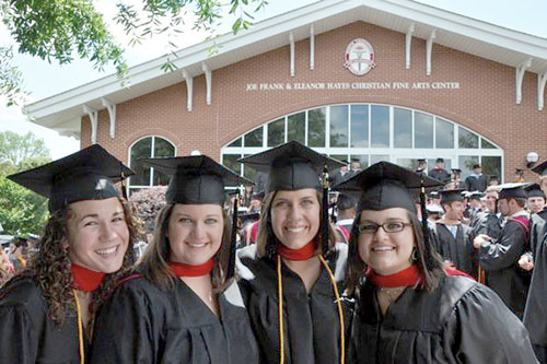 Awaiting their graduation ceremony are, from left, Nancy King from Youngsville, N.C.; Ashley King from Greer; Sarah Woodley from North Myrtle Beach; and Brett Seay from Spartanburg.Thomas Haggai encouraged 250 North Greenville University graduates not to live in the past but to allow the past to live in them during the school’s commencement ceremony May 7.