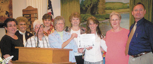 The WMU group of Plum Branch Baptist Church was recognized as a new organization during the spring meeting of Edgefield Baptist Association, which was held at First Bethany Baptist Church in McCormick. Members present at the meeting were (l to r) Becky Strickland, Patricia Storey, Margaret Dorn, Beth Ritter, Jean Wells, Shirley Hyde and Pat Golden. Also pictured are Carol Bryan, associational WMU director, and John Noblin, pastor of Plum Branch. WMU members not present were: Janice King, Beth Storey,Vivian Crawford, Brenda Holmes, Hazel Freeland, Katrina Newby, Joyce Prevatt, Dot Winn and Evelyn Wells.