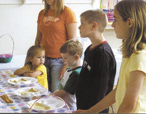 The children of Warrior Creek Baptist Church, Gray Court, used ordinary baking ingredients as part of an object lesson to help them learn about the burial and resurrection of Jesus. The children also stuffed plastic eggs with colored jelly beans along with copies of a poem explaining the spiritual meaning represented by the different colors, which they distributed to the congregation. The children’s activities were led by Katie Freeman and Debbie Burkhalter.