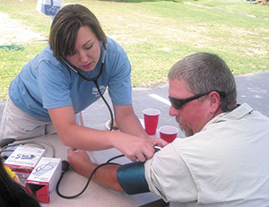 Nurse Crystal Squires does blood pressure screenings.Several soloists sang at the event, including Tracey McClellan, Corey Anderson, Caroline Blanton and a senior adult choir. The clothing drive was coordinated by Sonya Edwards, Angela Moore and Teresa Brazier. “We wanted to do this to share Jesus and show this community that we love them and he loves them,” Brazier said.
