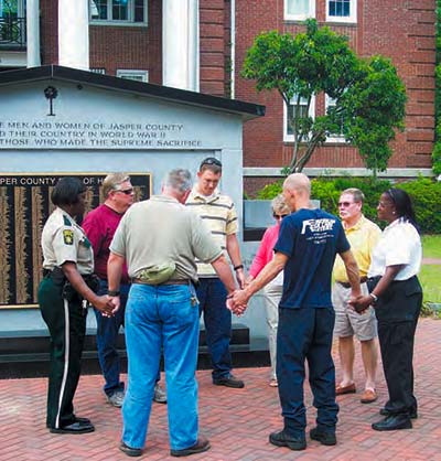 Faith Baptist Church, Ridgeland, recently joined other Americans in prayer for the nation and its leaders. Faith Baptist organized prayer around the flagpoles of the Jasper County Courthouse and Ridgeland Town Hall. Each group had nine participants, for a total of 18, which included sheriff Greg Jenkins and councilman Henry Etheridge. Other participants included the church congregation, police officers and county sheriff’s deputies. The event concluded with a prayer service held at the church. Musical performances were presented by Robin Malphrus and the interpretive movement team, Hands of Faith. A devotional was given by pastor and sheriff Greg Jenkins, who taught from the book of Daniel about the importance of continuance in prayer.