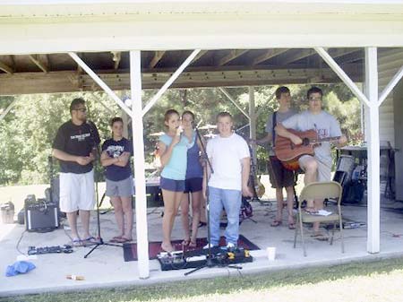 Performing at Evergreen’s “Spring Fling Thing” was the church’s youth praise band, featuring Josh McKeown, Court-ney Hatchell, Raley Stone, Tamara Gulledge, Ryan Bunch, Damon Earp and Tim Bell.The day began with an inflatable slide that was as tall as the family life center. Inside the building was an inflatable bouncy castle for the younger children. There was also a dunking booth, “which seemed to be the most popular attraction on such a hot day,” Hooks said.