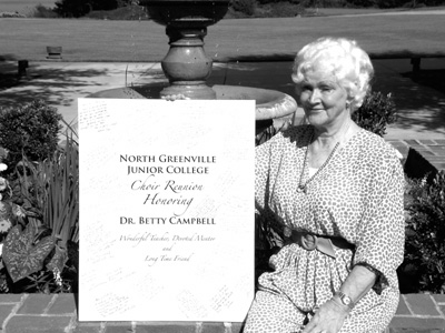 A YouTube video celebrating the 80th birthday of Betty Smith Campbell inspired a reunion of choir members from North Greenville University’s days as a two-year college. Beulah Webb Pope, class of 1962, saw the video and called Campbell, who along with her husband Bracey, led the music department and the choir at North Greenville from 1959-65. The event was held July 23-25 at the Madren Center in Clemson. Though her husband is now deceased, Campbell, at 82, is a tenured professor at Judson College in Alabama and teaches a full schedule. One participant in the reunion said, “The most exciting thing the Campbells gave us was the joy of beautiful choral singing. It is an amazing experience to be part of a group that creates a glorious sound.” Campbell described the years that she and her husband spent at North Greenville as “the happiest time in their lives.” Pictured below is Campbell holding a poster signed by all attending the reunion. Pictured next is the “reunion choir” as they break into song.