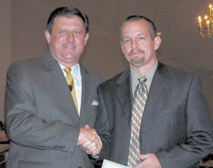 MILES BRIDGES, right, was licensed to the ministry by Apalache Baptist Church, Greer, on Aug. 9. Pictured with Bridges is Eddie Cooper, pastor of Apalache.