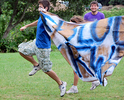 A missionary youth run a relay race carrying his team banner while hopping on one foot. Jonathan Phillips, director of First North’s junior high students, laughs on the sidelines.“The group from NSBC not only brought ‘stuff’ to the youth, they also were well prepared to minister to the heart, bringing words of encouragement and gifts of eternal value.” ? Gillian Laswell*