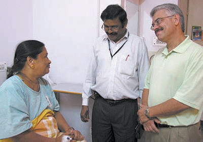 Jackie Jenkins (right), pastor at Union Baptist Church, Lancaster, and volunteer chaplain at Springs Memorial Hospital in Lancaster, and staff chaplain S. Gangaiah visit and pray for a patient at Bangalore Baptist Hospital.