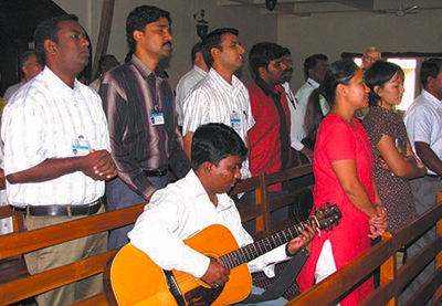 Clinical pastoral education students and hospital staff chaplains worship during morning devotions led by the South Carolina chaplains in the Bangalore Baptist Hospital.