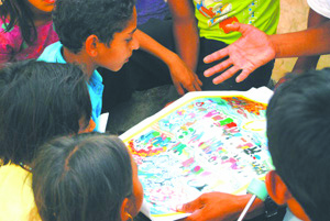 Using an illustrated poster that depicts the “Creation to Christ” story, Nepali Christians share the gospel with those waiting to see the “American doctors” at the traveling clinic.