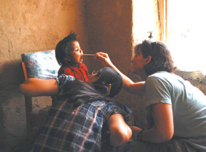 A volunteer nurse, a member of Mount Olive Baptist Church in Nichols, examines a young boy’s gums. Many Nepali children and adults suffer from dental pain, severe dental problems and plaque buildup. Volunteers gave every patient a hygiene kit that included a toothbrush and toothpaste.