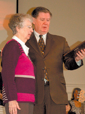 Lee Road Baptist Church, Taylors, recognized Juanita McGaffic on Nov. 1 upon her retirement after 20 years as church organist. Presenting a plaque to McGaffic on behalf of the congregation is minister of music Ted Adams.