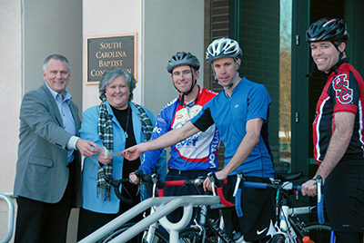 South Carolina Baptist Convention executive director-treasurer Jim Austin and South Carolina WMU associate executive director Sandra Tapp accept a hand-delivered check from cyclists Kyle Owings, Stephen Cannon and Tim Davis from Cedar Shoals Baptist Church, Enoree.On Jan. 18, Cedar Shoals pastor Stephen Cannon, minister of music Kyle Owings and deacon chairman Tim Davis embarked on a five-hour bicycle ride from the Spartanburg-county church to the South Carolina Baptist Convention building in Columbia. The trio delivered the church’s Lottie Moon offering check, which exceeded the church’s goal of $15,000 and its 2008 contribution of $10,000.