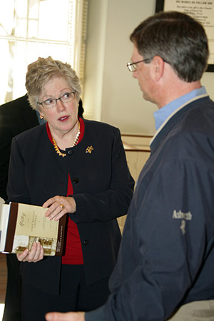 Molly Marshall chats with Marshall Blalock, pastor of First Baptist Church.