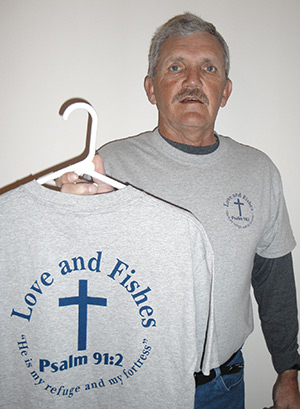 What he did was design a T-shirt with a cross encircled by the words, “Love and Fishes,” and a reference to Psalm 91:2: “He is my refuge and my fortress.”