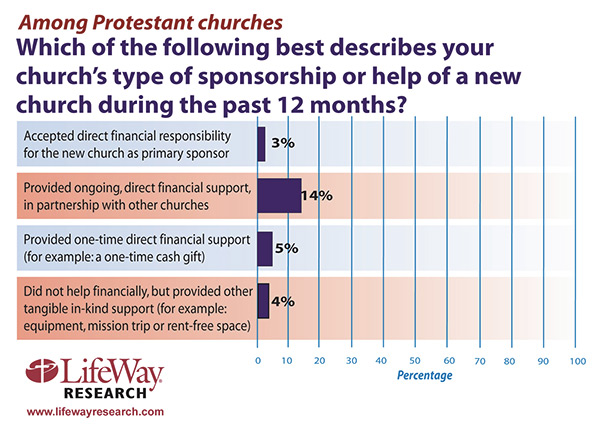 A newly released LifeWay Research survey of 1,004 Protestant pastors found only 3 percent of their churches served as the primary sponsor of a church plant (new congregation) during the previous 12 months, and only 14 percent gave financial support in partnership with other churches to help start new congregations.