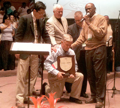 Jim Goodroe, director of the Spartanburg County Baptist Network, kneels to receive prayer support from leaders and participants at the April 17 closing service of the Ethnic America Network (EAN) Summit in Boston. The leaders “passed the torch” to Goodroe, who is coordinating efforts to bring the national conference to the Upstate in 2012. Standing, from left: Chandler Im, EAN director; Alex Turoczi, EAN liaison for the Boston Summit; Gregg Detwiler, director of Boston’s Emmanuel Gospel Center; and Roland Cooper (with microphone), senior associate pastor of Jubilee Christian Church in Boston.Jim Goodroe, director of the Spartanburg County Baptist Network, is heading up the planning for the event, to be called the “Carolinas Summit.”