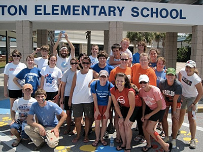 A group of college students help Crosspoint paint at a school.Crosspoint works with Bluffton Elementary. In many cases, church plants meet in schools and have an obvious relationship. But Crosspoint meets in a movie theater.. “No strings attached” service projects drive this ministry. They have done several painting projects, and a mission team helped build outdoor sports storage closets at the school. Crosspoint has an outdoor trailer and a “bounce house” they have used at the school’s open houses to serve popcorn and sno-cones to the children, parents and staff. The church sponsored an end-of-the-year block party in June and will sponsor a “wish list” in August for church members to gather needed supplies for the new school year to help replenish classrooms. “We do this to help build relationships and to let the community know that we care about them – with no strings attached,” said Galloway.
