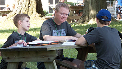 Marlon Hutchins and sons Joshua (left) and Jeremy study and discuss the morning’s devotion, “Ready to Work Unhindered.”The group of nine is a mission team, primarily members of Saluda River Baptist Church in West Columbia. Together, they answered a call from the North American Mission Board to travel to Philadelphia as part of the PowerPlant program, which trains youth to work alongside church planters to reach out to neighbors with the gospel of Christ.