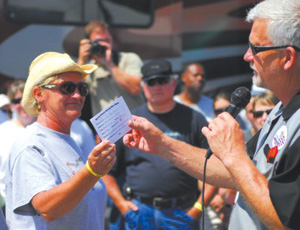 Waccamaw Baptist Association recently combined outreach efforts with South Carolina Faith Riders during Bike Week at Myrtle Beach. Chris Jones, who donated a Harley Davidson motorcycle in honor of her son Scott Moore, hands South Carolina Faith Riders state coordinator Dwight Mobley the winning entry card. The winner was Dania Latagne of Moncks Corner.