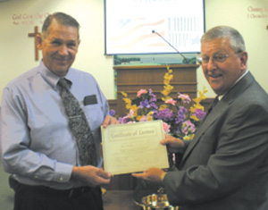 Bruce Chrysler was licensed to the ministry by Slabtown Baptist Church, Easley, on Aug. 29. He has been active in ministry to senior citizens’ groups and schools in the area, as well as sharing the gospel through devotions and demonstrations on how to build wooden long bows and arrows at Hagood Mill in Pickens. Pictured with Chrysler is pastor George Tate, who presented the certificate of license.