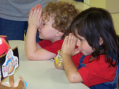 Preschool participants Landon Nobs and Erica Bryant find their prayers answered when the food collection goal is exceeded by the end of the week.During the summer months, food pantry shelves empty quickly, said Jenny Kennedy, executive director of LICS. “When children are home from school and not receiving the schools’ food services, many of our community’s parents need help to feed their families,” she said.