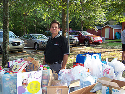 Church member Bill Coen welcomes kids and families during registration and accepts their donations each night.It did not. VBS leaders and parents reached into their pockets and sent a church member to the closest grocery store. When he returned, a triumphant crowd gathered to help unload the last 90 items that would push Saluda River Baptist just over the 1,000-food-item mark for the week.