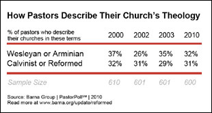 – Among pastors of non-mainline churches, 35 percent said they were Reformed or Calvinists, and 30 percent said they were Wesleyans or Arminians.