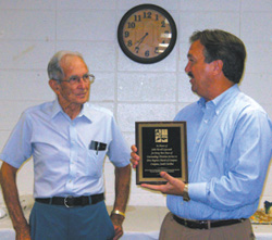 Terrell Lipscomb, left, custodian at Cowpens First Baptist Church, was recently honored with a special reception for 42 years of service. Pictured with Lipscomb is pastor William Westafer, who presented a plaque of appreciation on behalf of the church.