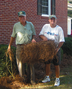 S.W. Richardson and Wayne Reason, members of Nebo Baptist Church, Britton’s Neck, are pictured as they prepare the church grounds for an Oct. 10 homecoming celebration.