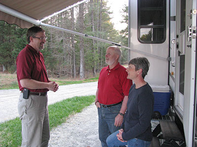 Tim Hughes (left), director of White Oak Conference Center, talks with Jos? and Lynette Stephens under the awning of their RV, stationed at White Oak’s new RV park while the Stephenses volunteer there.Jos? and Lynette Stephens, of Moncks Corner First Church, exceed on all three counts – and in March and April, their beneficiary has been White Oak Conference Center.