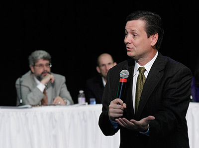 North American Mission Board president Kevin Ezell makes a point during the May 11 trustee meeting in Alpharetta, Ga. In the background are (from left) Doug Dieterly, first vice chairman of NAMB’s board, and Tim Dowdy, chairman.