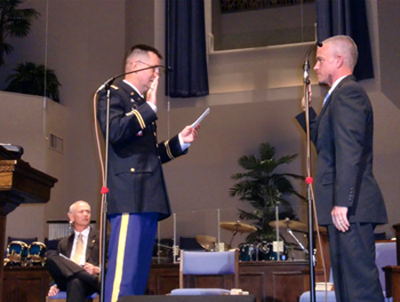 Michael C. Coleman, minister to students for the past five years at Ocean View Church, Myrtle Beach, was commissioned as a U.S. Army chaplain (captain) on May 1. He reported to Fort Jackson in Columbia on May 22 to begin chaplain basic officers leadership course training for the next three months, and will then report to Fort Campbell, Ky., to serve with the 101st Airborne Division. He and his wife Jerri have three children: Catherine, Christian and Caleb. Pictured with Coleman, right, are Chaplain (Col.) Keith Travis, retired from NAMB (seated), and Chaplain (Lt. Col.) Tim Atkinson administering the U.S. Army Oath of Office.