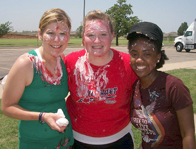 Haley Vickery, a Lander University student; Brittany Watson, summer activities director at Oklahoma Baptist Home for Children; and Markia Randle, a South Carolina State University student, show off their “pie faces” they earned from the children at the end of a scavenger hunt.