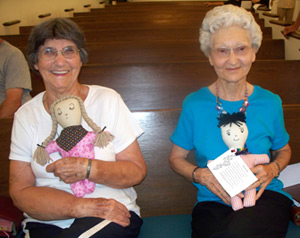 The WMU of Barker’s Creek Church, Honea Path, have been busy making “witnessing dolls” for the church’s youth to distribute while on a mission trip to Chicago. The dolls are specifically designed with faces on both sides and necklaces of beads to provide opportunities for the youth to share the gospel during their World Changers mission trip this month. Pictured are WMU members Lettie Ann Wright and Sara Wilson demonstrating the two faces of the dolls, which represent a person’s life before and after accepting Christ.