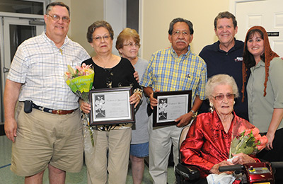 Standing behind Dru Graves (seated) are, from left, Richard Spearman, pastor of St. Helena Church; Sylvia Vargas; migrant ministry coordinator Vicki Farrow; Mario Vargas; Baptist Church of Beaufort pastor Jim Wooten; and Cindy Villalta, who served as an interpreter at the recognition service.