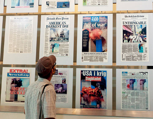A man studies a historical display of front-page reactions to 9/11.“For Freeman, the experience itself was spiritually a turning point,” Taylor Field, a North American Mission Board missionary in New York, told Baptist Press. “He was, I would say, a missionary’s son and went through the motions. But … that was really the time he stepped up to the plate. What we see now after 10 years is that he really dedicated himself to the Lord and began to speak about what God was doing in his life.”