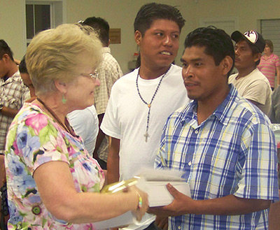 Vicki Farrow gives a Spanish-language Bible to a migrant farm worker.“The potential for the gospel’s influence to spread is tremendous as it affects relationships within the migrant community and relationships with family and friends back home,” said Sue Harmon, associate director of the South Carolina Baptist Convention childhood ministry group. “Although St. Helena may be just a temporary home for them, those 74 who accepted Christ as Savior now have an eternal home in heaven.”