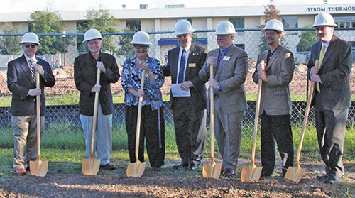Breaking ground, from left: Hank D’Antonio, architect; donors Floyd Whitfield and Margaret Lightsey Payne; CSU president Jairy Hunter; trustee Timothy Spurling; board chairman Scott Wood; and Michael Bryant, religion professor.“The Christian Leadership Building will be a signature building located in the center of campus,” said CSU president Jairy Hunter, “signifying our commitment to integrating faith in learning, leading and serving. Faith integration will be the watchwords of the future of CSU.”