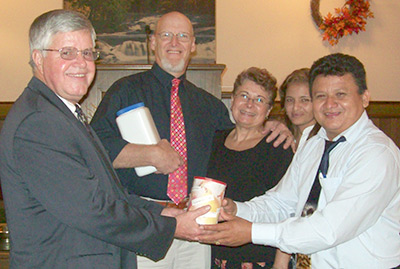 Rehoboth Church, Florence, welcomed a Nicaraguan pastor and presented him with a “coffee can collection” to support his work. Pictured, from left, are Drexell Turner, Steve Wetherbee, Silvia Wetherbee, Claudia Sanitlez and Diomededs Sanitlez.