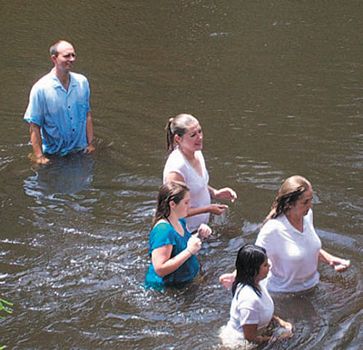 Beulah Church, Branchville, held a baptism service on Aug. 21 at the Edisto River home of members Robert and Peggy Barker. Ken Frederick (left), pastor of Blackville First Church and son of Beulah pastor Robert Frederick, baptized Rhonda Dukes, Hannah Tollison, Ashley Green and Emily McAlhany.