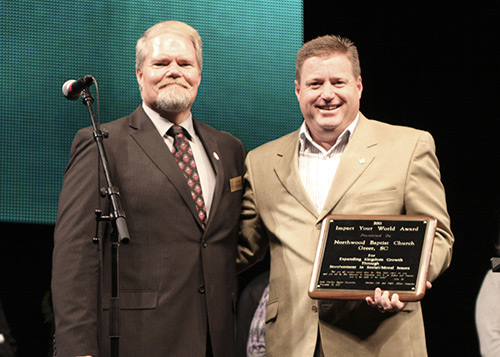 Northwood Baptist Church, Greer, was presented the annual Impact Your World Award for community service by the convention’s Christian Life and Public Affairs Committee during the SCBC annual meeting. Michael Joe Harvell, right, is the church’s pastor. Making the presentation is committee member Tony Beam.