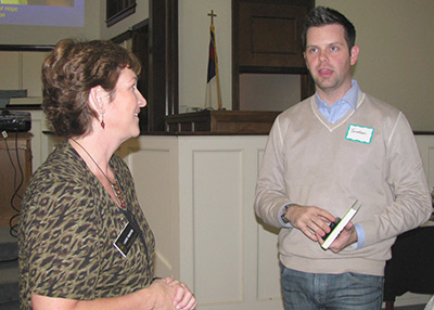 Laurie Register, executive director-treasurer for South Carolina WMU, talks with Jonathan Merritt, founder of the Southern Baptist Climate Initiative, at a symposium held Oct. 27 at Eau Claire Baptist Church in Columbia.