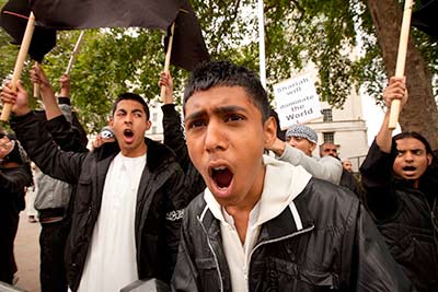 Arab youth call for shariah law in Britain during a protest in front of 10 Downing Street, the prime minister’s residence. As the headquarters of the British government, Downing Street is a frequent venue for protests in London.Signs for “Victoria” and “Waterloo” signal bustling railway stations above. Climb the steps from the Oxford and Piccadilly Circus underground stations to reach premier shopping districts. The Green Park station exit leads to a walk through tree-lined park paths to the ornate gates of Buckingham Palace.