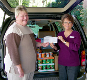 Residents, staff, family and friends of Martha Franks Baptist Retirement Community, Laurens, recently donated hundreds of non-perishable food items and a check to the Laurens Baptist Crisis Center. The theme of the food drive was “Bringing Gifts to the King,” and was an active way for the community to show the spirit of love and giving during the Christmas season. Pictured is Dina Hair (right), executive director of Martha Franks, presenting the check and food items to Kay Leagans of the Laurens Baptist Crisis Center.